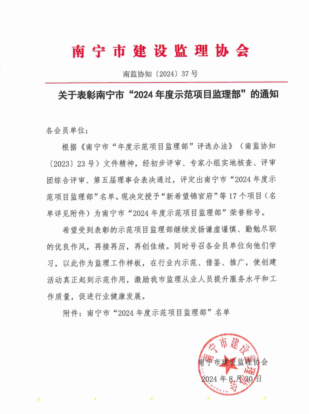 8月30日,南寧市建設監理協會公布了“2024年度示范項目監理部”評選結果,恒基咨詢監理的南寧市友愛南路13號小區危舊房改住房改造項目脫穎而出,成功入選。