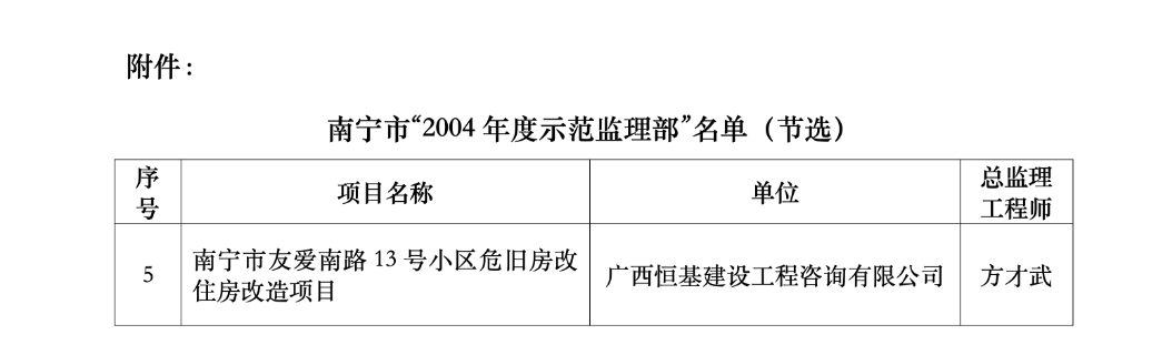 項目名稱:南寧市友愛南路13號小區危舊房改住房改造項目 項目總監:方才武 恒基咨詢監理團隊在項目建設過程中,嚴格按照國家相關法律法規及行業標準,以高度的專業素養和責任心,對工程質量、安全、進度等關鍵環節進行了全面、精準的把控。通過科學有效的監理措施和嚴謹細致的工作態度,確保了改造項目的順利進行,并有效提升了工程品質。 下一步,恒基咨詢將以此次獲獎為契機,繼續秉承“專業、高效、誠信、服務”的企業理念,為南寧市城市建設和發展貢獻更大力量。