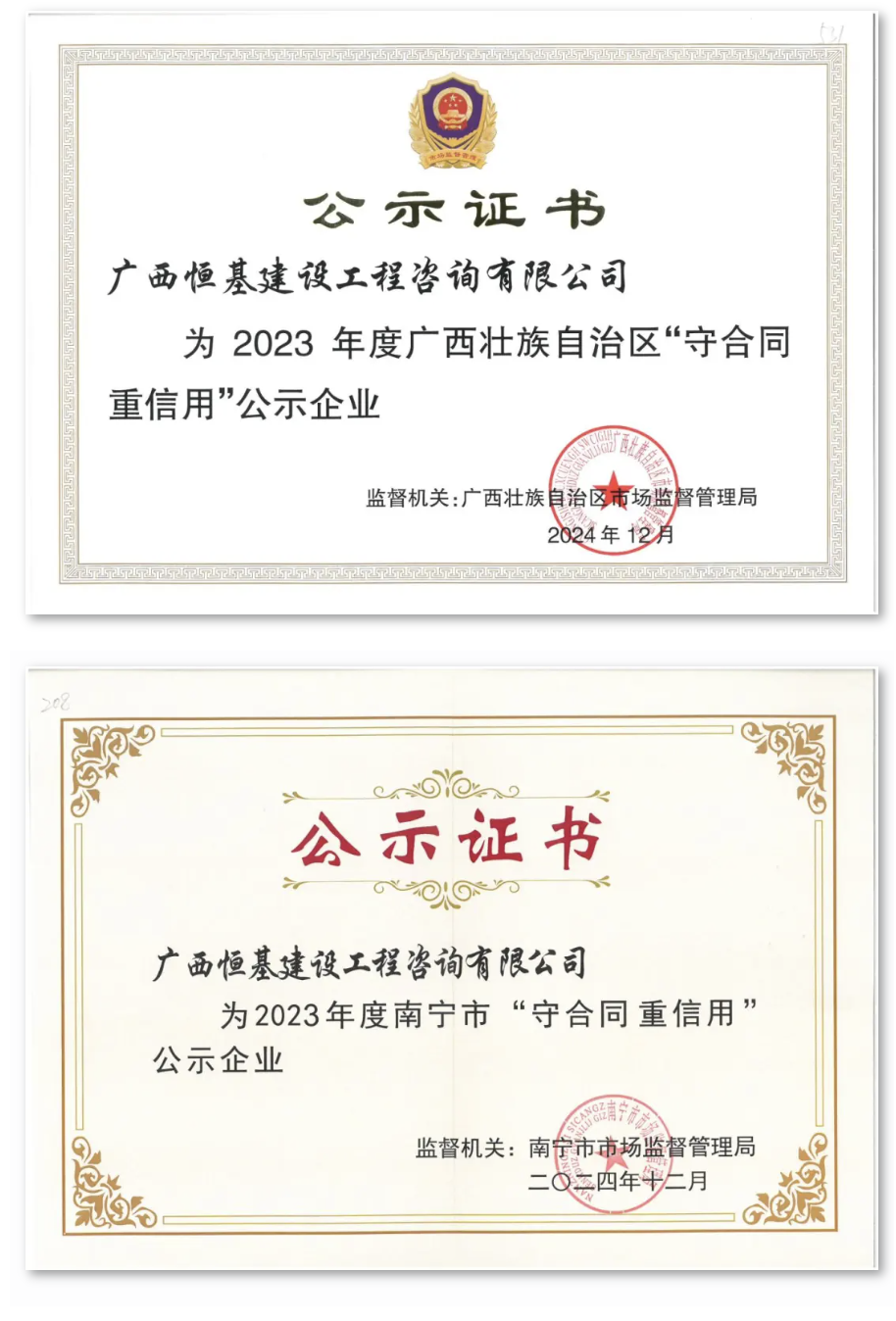 近日,恒基咨詢憑借卓越的市場信譽與優質的合同履約能力,成功斬獲廣西壯族自治區市場監督管理局與南寧市市場監督管理局分別公布的2023年度廣西、南寧市“守合同 重信用”公示企業這兩級殊榮。